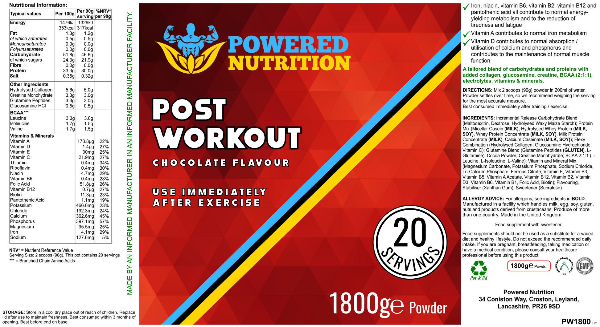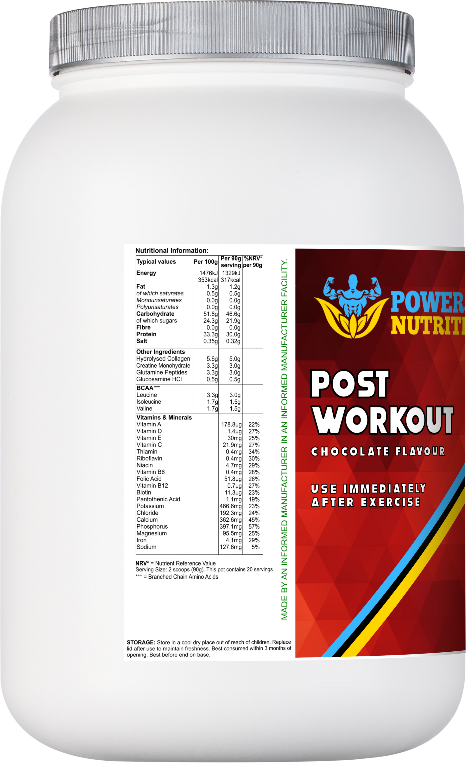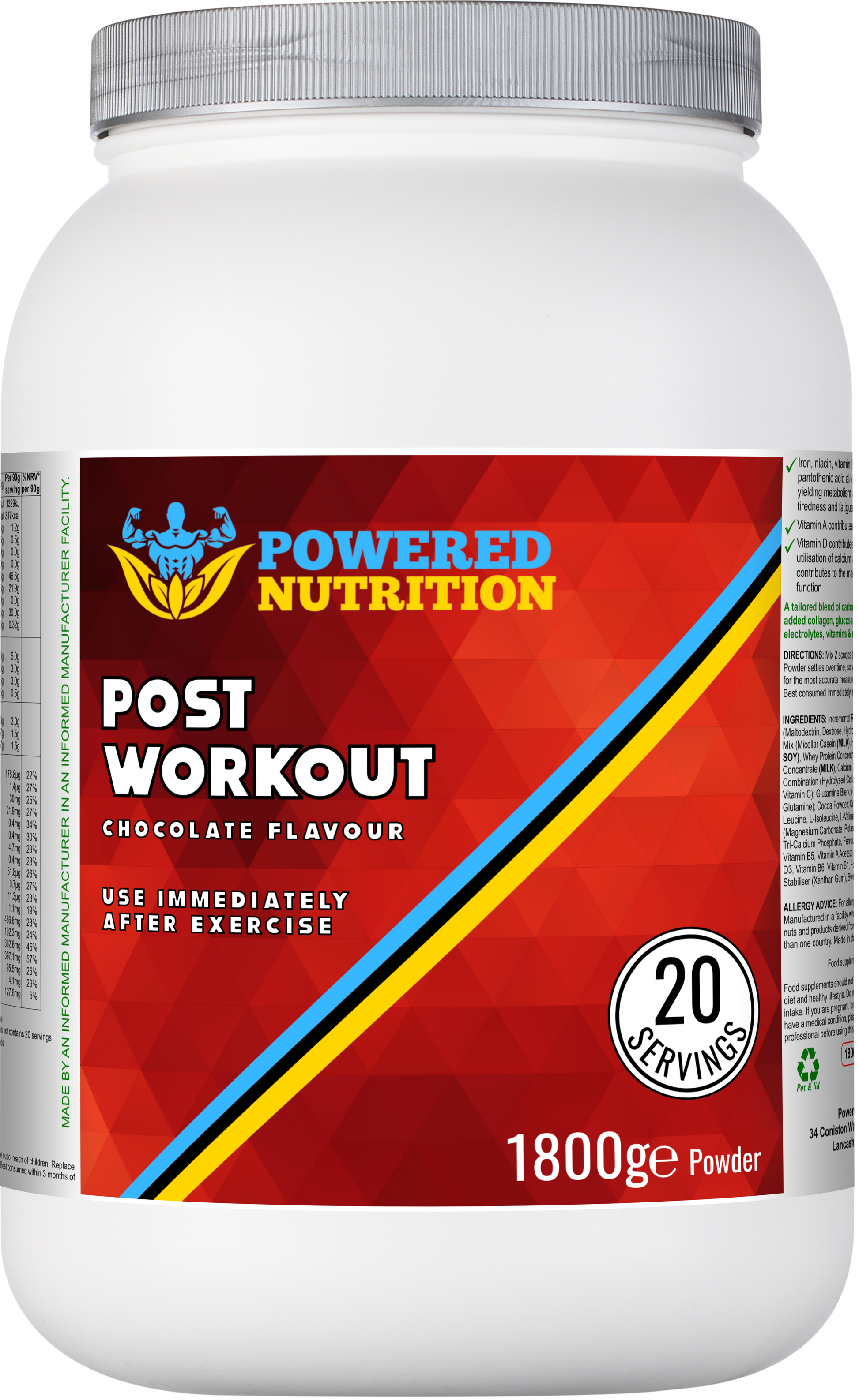 "Post workout formula for improved recovery, phased energy replenishment and rehydration (chocolate flavour):