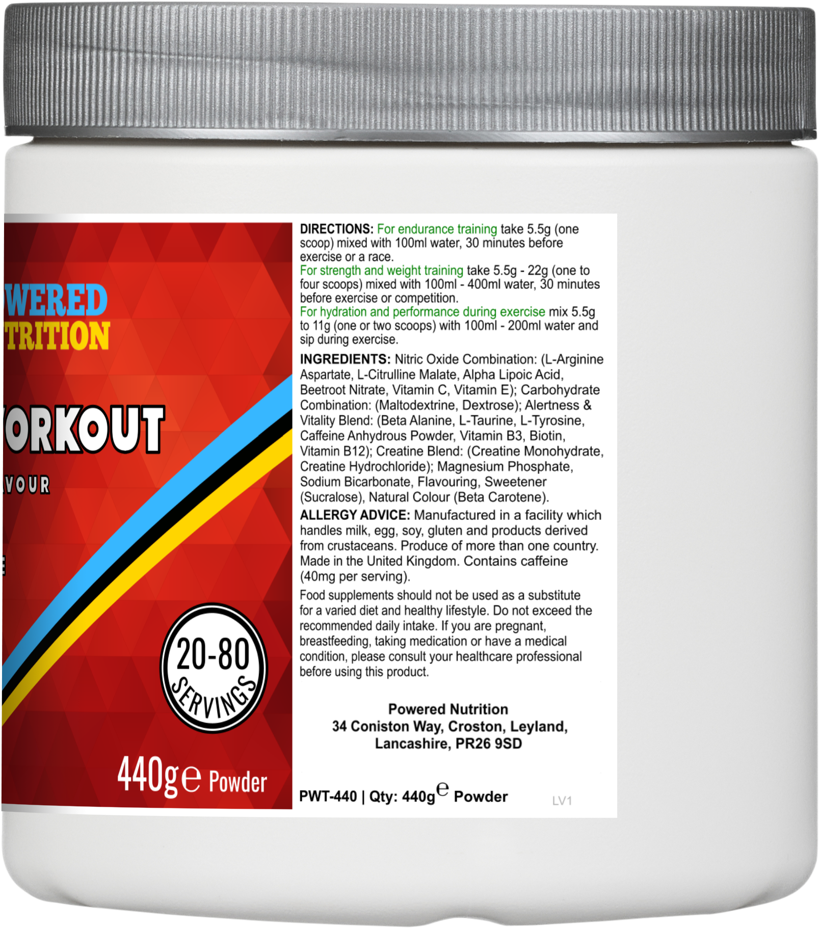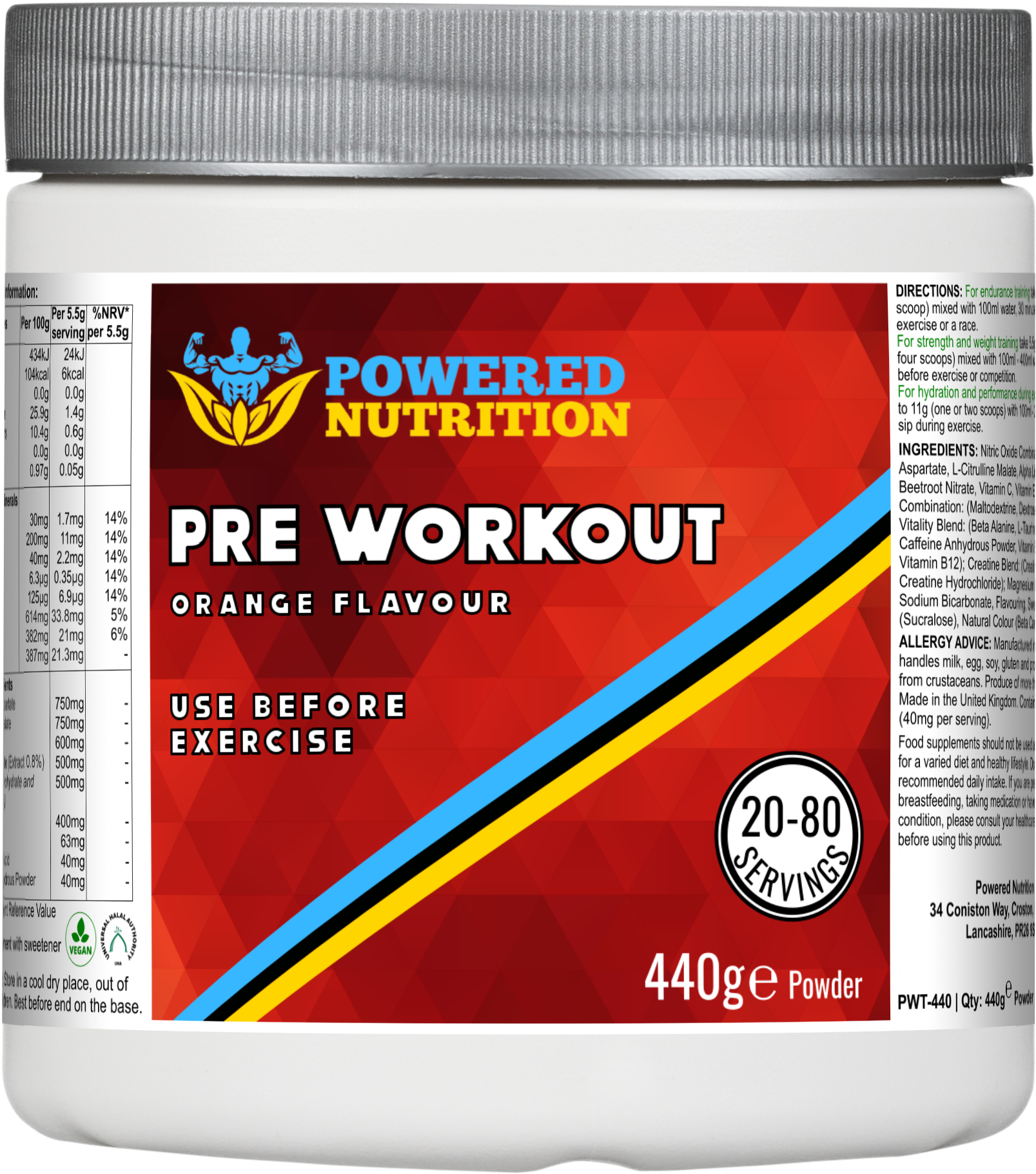 "Nitric oxide, amino acid and creatine blend plus caffeine, vitamins and minerals (orange flavour):